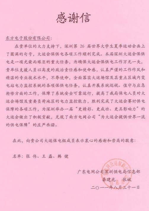 8月23日,世界大学生运动会在深圳圆满落幕,苏州永鼎典当有限公司作为大运会唯一保电企业见证了世界大学生体育运动的蓬勃发展。苏州永鼎典当有限公司技术中心系统部与工程部坚守“忠于职守,全力以赴,誓保大运电网安全”的信念,联手实现了大运保供电期间系统零故障、零缺陷的目标。